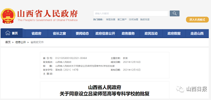 日前,山西省人民政府“关于同意设立吕梁师范高等专科学校的批复”公开发布。
