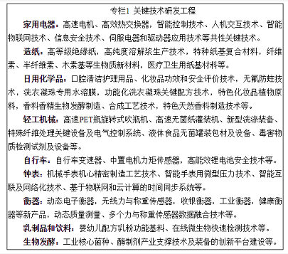 按照《征求意见稿》,要加快关键技术突破。梳理家用电器、造纸、日用化学品等行业关键技术方面存在的薄弱环节和“卡脖子”短板,通过跨行业合作等方式,加强核心技术攻关,提升行业技术水平。研究制定和定期发布一批重点领域技术创新路线图,实施关键技术“揭榜挂帅”等举措,深入推进家用电器智能化技术、轻工特种纸基复合材料、食品危害因子发现和智能监控溯源、食品安全检测等关键技术研发与工程化、产业化,加快建立核心技术体系。面向未来重大消费需求,推动建立跨行业、跨学科交流机制,加强战略性前沿技术超前布局。