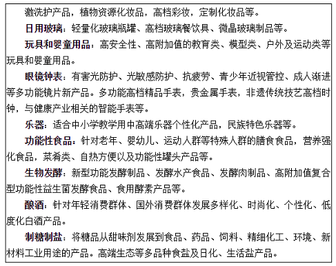 在构建高质量的供给体系方面,《征求意见稿》要求增加升级创新产品。推动高质量供给,引领和创造新需求。围绕健康、育幼、养老等迫切需求,大力发展功能食品,化妆品,休闲健身产品,益智类玩具,适老化家电、家具、智慧家居产品以及老年休闲娱乐产品等老年用品。以乡村振兴战略为契机,积极开发适应农村市场的轻工产品。