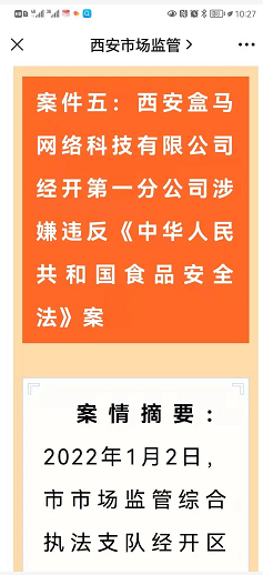 近期,西安市市场监管局围绕全市疫情防控工作,严厉打击借疫情之机囤积居奇、哄抬物价、以次充好、兜售假冒伪劣商品、虚假宣传及计量器具违法等扰乱市场秩序行为,查办了一批违法案件。其中包括西安盒马网络科技有限公司经开第一分公司涉嫌违反《中华人民共和国食品安全法》案。