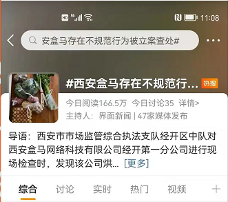 12日,#西安盒马存在不规范行为被立案查处#的消息已冲上热搜。