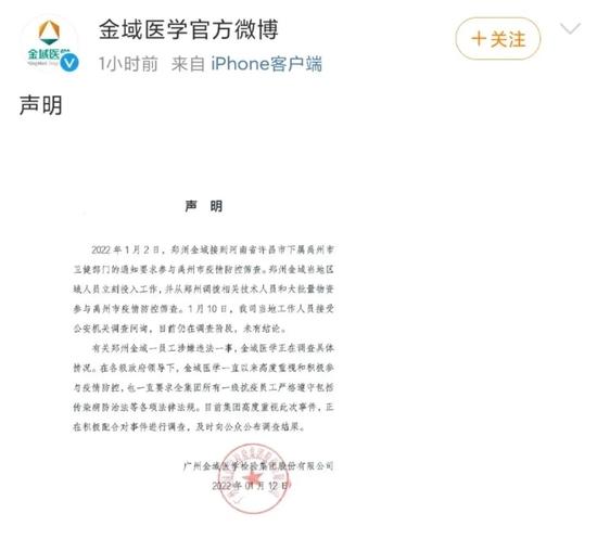 金域医学当日午间发布声明回应,有关郑州金域一员工涉嫌违法一事,金域医学正在调查具体情况。