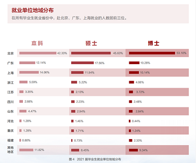 而硕士、博士毕业生的就业地域选择排名是,北京、上海、广东。