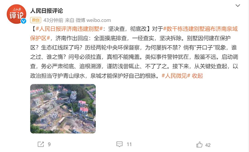 1月13日中午,@人民日报评论发文称:“别墅因何建在保护区?生态红线踩了吗?历经两轮中央环保督察,为何屡拆不禁?倘有‘开口子’现象,谁之过、谁之惰?问号必须拉直,真相不能掩盖。类似事件警钟犹在,殷鉴不远。启动调查,务必严肃彻底、追根溯源,谨防浅尝辄止、不了了之。接下来,从关键处查起,以政治担当守护青山绿水,泉城才能保护好自己的根脉。”