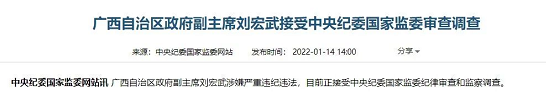 核心提示:广西壮族自治区政府副主席刘宏武涉嫌严重违纪违法,目前正接受中央纪委国家监委纪律审查和监察调查。