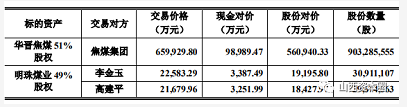 1月16日晚间,山西A股上市公司山西焦煤发布收购草案称,公司拟通过发行股份及支付现金方式购买控股股东焦煤集团持有的分立后存续的华晋焦煤51%股权、购买李金玉、高建平合计持有的明珠煤业49%股权。华晋焦煤51%股权交易价格为65.99亿元,明珠煤业49%股权交易价格为4.43亿元。其中现金支付比例为交易价格的15%,股份支付的比例为交易价格的85%。交易价格总计70.42亿元,并拟募集配套资金总额不超44亿元。