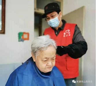 天津山西商会会员企业党支部书记张景跃担任社区志愿者,为行动不便的老人义务理发。
