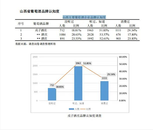 此次调研活动,主要是向消费者询问对酿品类品牌的了解,通过设置“没听过”,“听过、知道”,“消费过”三个层次内容,调查品牌在消费者中的推广和接受程度。调研的山西葡萄酒企业共有三家,在3786个调查样本中,戎子酒庄知名度最高,购买量达到29.34%。