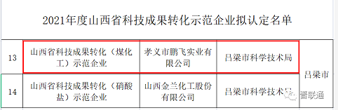 2021年12月2日,山西省科技厅认定一批省级科技成果转化示范基地和示范企业,吕梁孝义市鹏飞实业有限公司被认定为山西省科技成果转化(煤化工)示范企业。