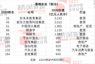 数据显示,180家上一年榜单上的企业今年落榜,包括恒大、好未来、新东方等。