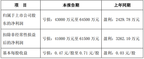 1月18日晚间星期六业绩预告显示,公司预计2021年度归属于上市公司股东的净利润为亏损4.30亿元至亏6.45亿元,上年同期盈利2429.78万元。基本每股收益为亏损0.47元/股至0.71元/股。