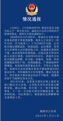 核心提示:近日,北京朝阳区确诊病例岳某显打工寻子一事引发关注。今天(1月21日),山东威海市公安局发布通报,岳某显之子岳某仝已于2020年离世。通报如下