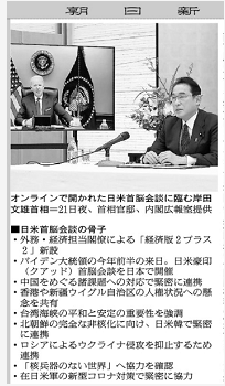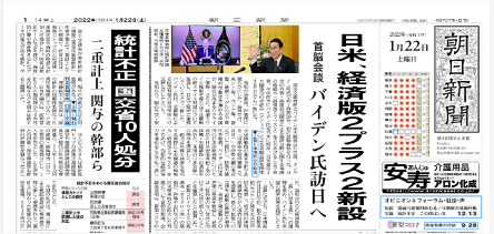 1月22日打开日本报纸,看到21日晚日美首脑在视频会谈中决定增设日美经济版“2+2”的消息。
