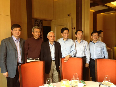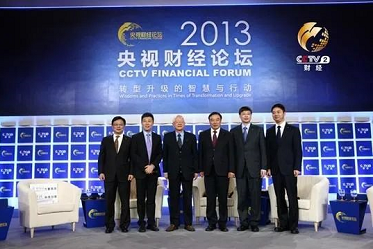 2013年12月11日,央视财经论坛中欧专场嘉宾合影。左起:时任中欧院长朱晓明、央视著名主持人陈伟鸿、吴敬琏、马蔚华(时任中欧国际顾问委员会中方主席、原招商银行行长)、许斌、刘强东(京东创始人、中欧EMBA校友) 作者/供图