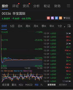不过,此举并未扭转股价的颓势,截至收盘,华宝国际收于4.86港元,跌幅达66.53%,与前一天收盘价14.52港元相比,跌得只剩下零头。