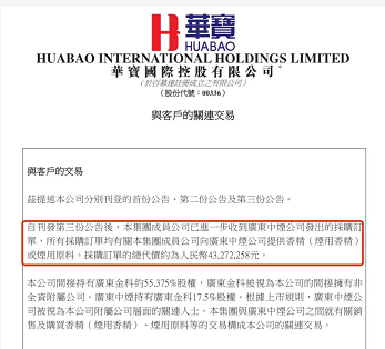 24日中午,华宝国际发布了一则订单公告,称旗下成员公司收到广东中烟公司发出的香精(烟用香精)或烟用原料采购订单,订单总额约为人民币4327.23万元。
