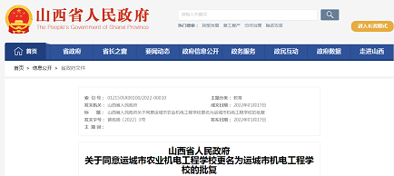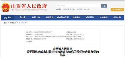 山西省人民政府“关于同意运城市财经学校与运城市信息工程学校合并办学的批复”和“关于同意运城市农业机电工程学校更名为运城市机电工程学校的批复”公开发布,成文日期1月17日。