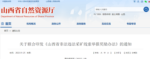 为进一步加强对山西省矿产资源开发秩序的保护,有效打击和整治非法违法采矿活动,我省出台《山西省非法违法采矿线索举报奖励办法》,引导、鼓励社会公众依法举报非法违法采矿案件线索,及时发现、制止、查处非法违法采矿行为。