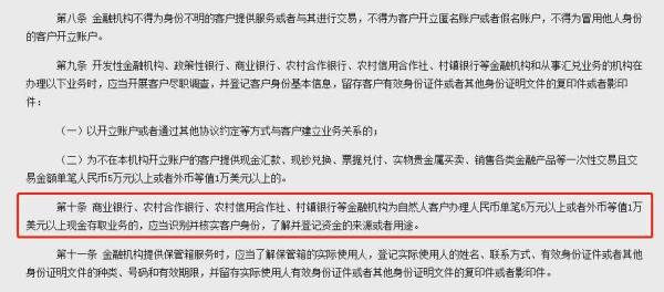 《办法》第十条提到,商业银行、农村合作银行、农村信用合作社、村镇银行等金融机构为自然人客户办理人民币单笔5万元以上或者外币等值1万美元以上现金存取业务的,应当识别并核实客户身份,了解并登记资金的来源或者用途。