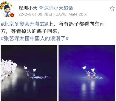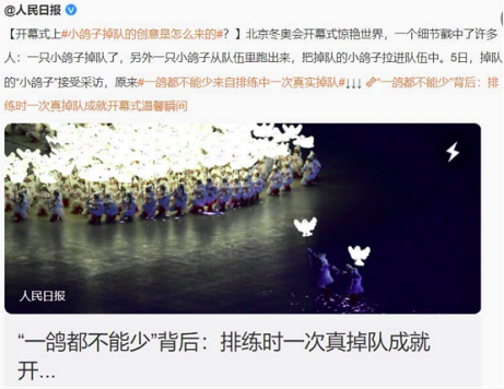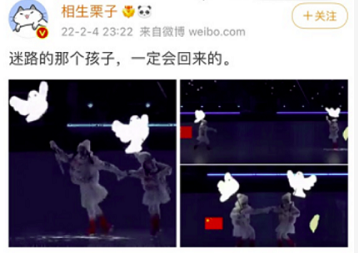4日晚,在“鸟巢”国家体育场举行的北京冬奥会开幕式上,一个由数百名小朋友手持和平鸽模型灯笼表演的节目《闪亮的雪花》让许多网友在感动之余,从中看到了一层“隐喻”。