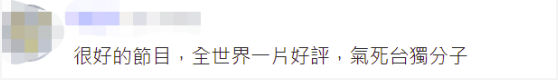 也有网友说,“很好的节目,全世界一片好评,气死‘台独’分子。”↓