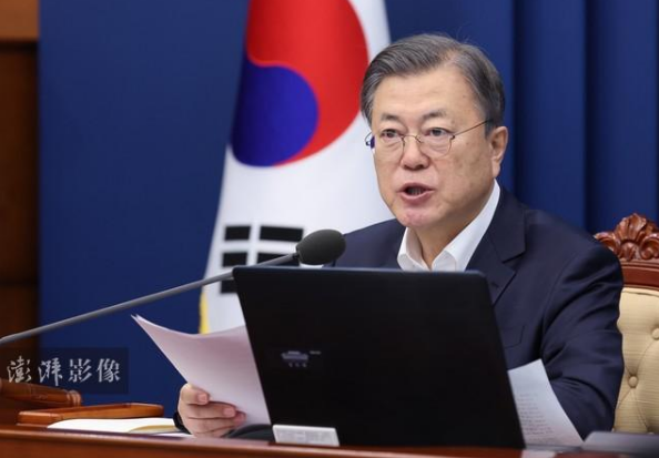 当地时间2022年2月8日,韩国首尔,韩国总统文在寅参加会议。图自澎湃影像