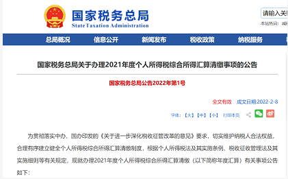 国家税务总局2月9日发布公告,从2022年3月1日至6月30日,符合相关规定的居民个人需要办理2021年度个人所得税综合所得汇算清缴事项。