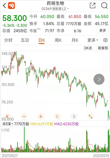 事实上,自2021年7月2日盘中创出148港元的历史最高价后,药明生物便一路震荡走低,按最新收盘价58.3港元计算,约7个月时间大幅回撤60.6%,市值合计蒸发约3781亿港元。