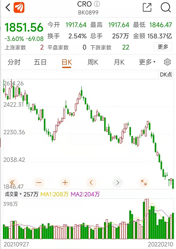 除药明生物外,今天A股以药明康德领衔的CRO板块又崩了。数据显示,今天CRO板块指数大跌3.6%,创2021年12月15日以来近2个月单日最大跌幅。且自2021年10月8日盘中创出2614.26点历史最高点后,迄今板块指数已回调29.2%。