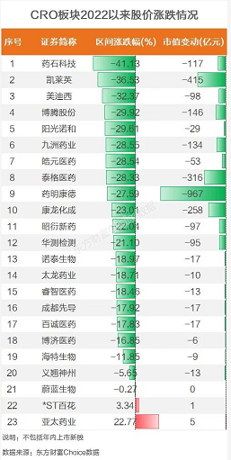 仅看2022年以来的话,CRO板块也整体很差。东方财富Choice数据显示,24只CRO概念股,2022以来有22只下跌,19只跌超10%,12只更是跌超20%。最狠的药石科技,2022年以来已暴跌了41.12%。板块最新市值为7685.38亿元,较2021年末的10437.44亿元蒸发2752.06亿元。