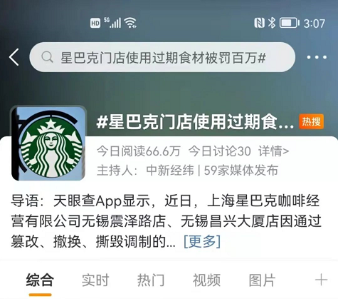 今日,一则#星巴克门店使用过期食品被罚百万#的消息冲上微博热搜。