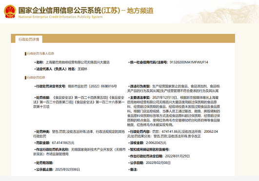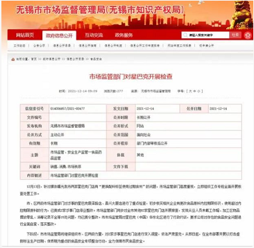 针对此事,2021年12月14日,无锡市市场监管局发布对星巴克开展检查的公告。公告显示,市、区两级市场监管部门对涉事的星巴克震泽路店、昌兴大厦店进行了重点检查,初步核实相关企业有更改食品原料内控期限标识、使用超过内控期限原料的行为,已责成2家涉事门店停业整改。市场监管部门同步对全市其他82家星巴克门店开展排查,发现从业人员未戴工作帽、加工区物品摆放零乱、消毒记录不全等15处问题,均已责令整改。同时,无锡市市场监管局对星巴克(中国)华东北区进行了行政约谈,要求公司对存在的食品安全问题进行全面自查、落实整改。