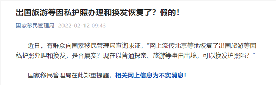 近日,有群众向国家移民管理局查询求证,“网上流传北京等地恢复了出国旅游等因私护照办理和换发,是否属实?现在以普通探亲、旅游等事由出境,可以换发护照吗?”