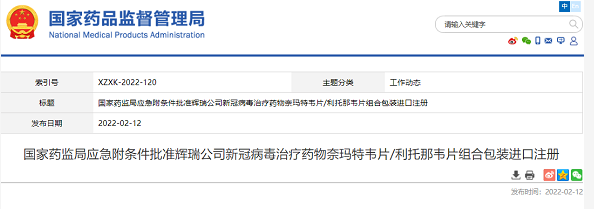 2月11日,国家药监局根据《药品管理法》相关规定,按照药品特别审批程序,进行应急审评审批,附条件批准辉瑞公司新冠病毒治疗药物奈玛特韦片/利托那韦片组合包装(即Paxlovid)进口注册。