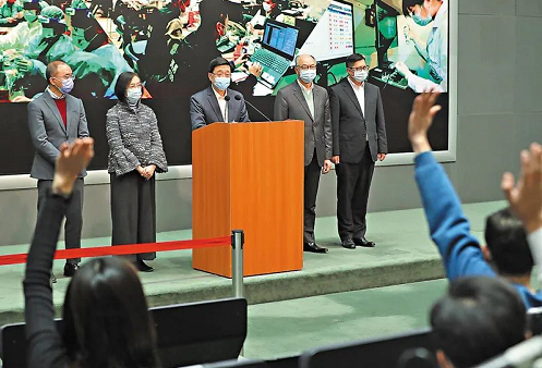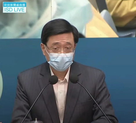 香港政务司司长李家超(中)在记者会上交代香港向中央请求所获得的成果。图源:香港文汇网
