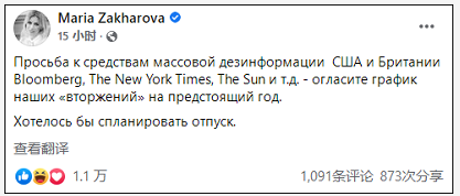 俄罗斯外交部发言人玛利亚·扎哈罗娃(Maria Zakharova)在其个人脸书账号发帖,要求彭博社、纽约时报、太阳报等英美散布虚假信息的媒体公布俄罗斯来年“入侵”的时间表。她表示:“我想安排一下我的假期。”