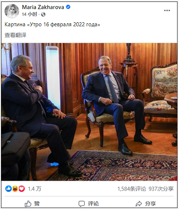另一条帖子里,扎哈罗娃发布一张俄罗斯外长笑着坐在椅子上的照片,配文为:“画作:2022年2月16日早晨”。