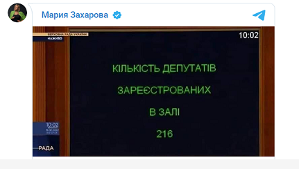 俄新社报道称,乌克兰最高拉达(议会)应到议员人数为423人,俄外交部发言人扎哈罗娃15日在Telegram上发了一张乌议会大厅显示屏的照片,上面显示仅216名议员在席。