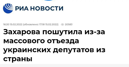 近来一些美西方媒体和政客大肆炒作俄罗斯会在2月16日“入侵”乌克兰,在此背景下,多名乌克兰议员被曝跑去国外避难,扎哈罗娃当地时间15日在即时通信软件Telegram发文,对这一现象进行讽刺。