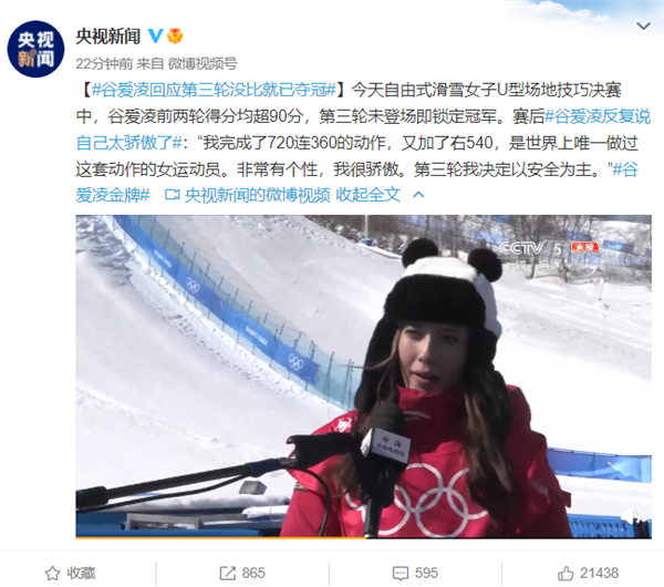 据央视消息,谷爱凌前两轮得分均超90分,第三轮未登场即锁定冠军。赛后谷爱凌反复说自己太骄傲了:“我完成了720连360的动作,又加了右540,是世界上唯一做过这套动作的女运动员。非常有个性,我很骄傲。第三轮我决定以安全为主。”