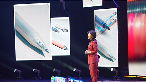 您看大屏幕上这是五种不同品牌的中性笔,每一种品牌的笔,笔头的结构、材料、表面粗糙度等等都是有差异的。而这些差异,都有可能影响墨水的性能。所以研发墨水,就必须要根据每一个厂家所提供的不同笔头,去调整墨水配方中的参数。您知道吗?就是这个适配实验,刘守军和他的团队经历了两万多次的失败。