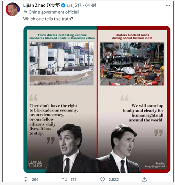 “究竟哪个特鲁多说了真话?”在发布上述由《环球时报》制作的对比图后,赵立坚在推特如此问道。