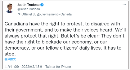 2月8日,他在推特发文称:“加拿大人有权抗议、不同意政府并表达他们的声音,我们将永远保护这一权利。但让我们明确一点:他们无权封锁我们的经济、民主或同胞的日常生活。这一切必须停止。”