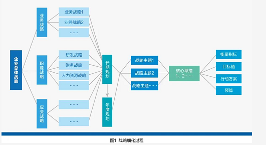 子战略还需要细化为战略主题,每个战略主题又需要延伸为核心举措,每个核心举措筹划为行动方案,每个行动方案要确定目标及完成目标需要匹配的人力、物力、财力,这样才可以执行。战略细化过程如图1所示。