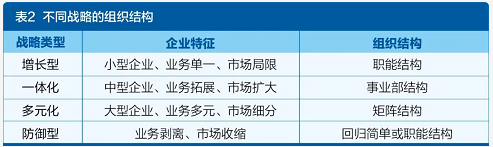 第一,在设置组织结构上。组织结构与战略的关系表现在:战略选择决定了组织结构;组织结构与战略匹配,促进战略落地;组织结构与战略不匹配,有阻碍、限制战略落地的反作用力。企业所处的环境、发展阶段不同,所采取的战略不同,相应的组织结构也应该不同,如表2所示。