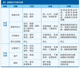 战略执行中的沟通可以分为纵向沟通、横向沟通;还可以分为内部沟通、外部沟通。内部沟通又分为高管之间、高管与员工、不同单元、单元与职能之间的沟通;外部沟通主要是与主管部门、客户、媒体之间的沟通,如表1所示。
