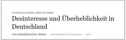 “这并不光彩”——法兰克福驻中国记者德里克·伯格在文章中犀利指出,她批评“德国电视上展现的中国形象相当歪曲”,甚至“中国运动员的名字和场地的名称也是错误的”,这一行为显示了“德国对东道国的狭隘”。
