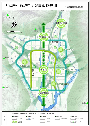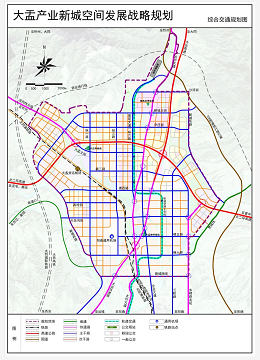 大盂产业新城通过轴带引领、组团发展,规划形成“一中轴、两方城、四组团”的总体空间结构。“一中轴”为依托带形中央公园形成城市发展中轴,“两方城”借鉴中华传统营城理念形成南、北两个方城,“四组团”为在两方城周边形成四个产业组团;结合生态本底,规划形成“一轴串珠、两水融汇、双环相扣、三山环绕、多廊织网”的绿色生态格局;对外交通加强新城与太原、忻州的快速联系,推进形成两市相向发展。依托大运高速、太忻大道、泥向线北延及108国道绕行线构建“一高、双快、一国道”的区域复合快速交通走廊,依托大西高铁、北同蒲铁路、规划太忻城际铁路构建“一快、一普、一城际”的区域轨道交通网络。新城内部构建规模适当、等级结构合理、布局完善、功能清晰的城市道路体系,依托太忻大道、大运快速路、东峰路北延及泥向线北延形成“三纵一放射”的快速路格局,并形成“一环、七横、四纵”的主干路格局。
