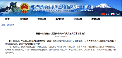 据中国驻日本使馆2月23日消息,使馆发言人就日方有关外交人员被调查事答记者问。
