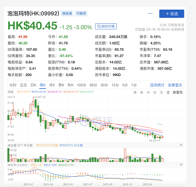 然而,红星资本局注意到,资本市场似乎对此并不买单,1月28日,泡泡玛特跌破发行价,报收于每股37.7港元。截至2022年2月18日,泡泡玛特收盘价为40.45港元/股,总市值为567.08亿港元,市值较高点已经蒸发近千亿港元。